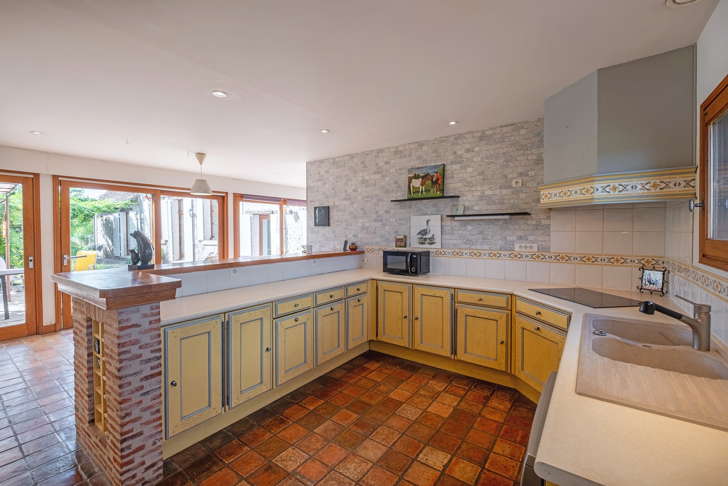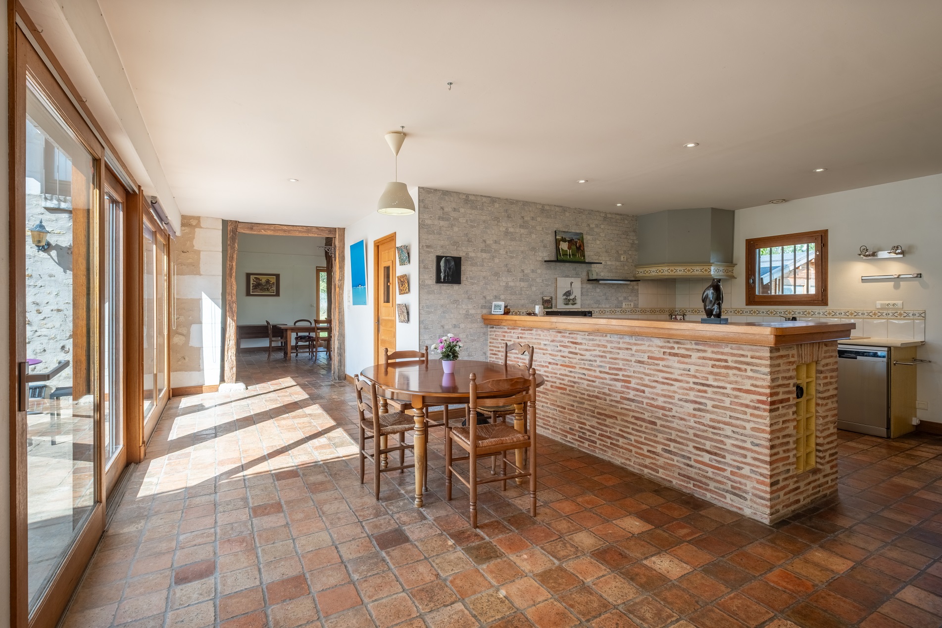 une grande cuisine ouverte de 38 m² avec poêle à bois et donnant sur la