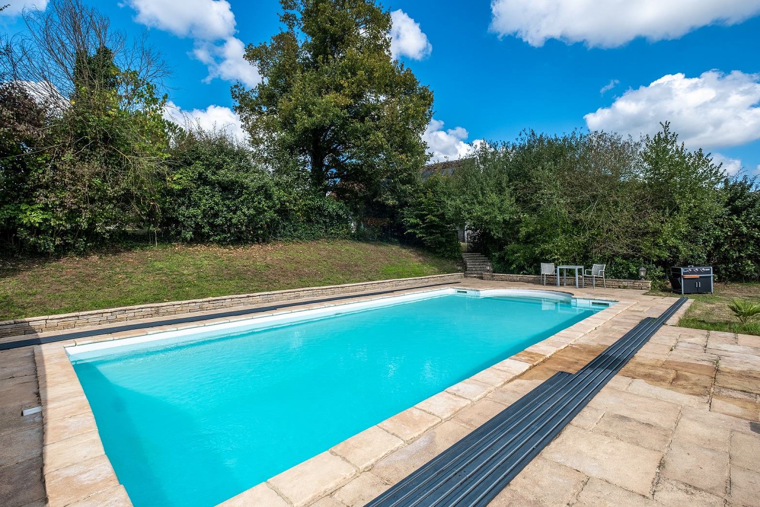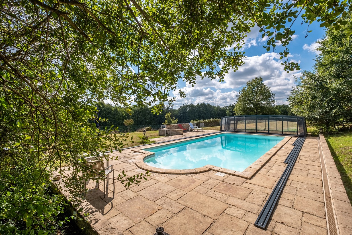 Pierres et poutres apparentes. Piscine couverte et chauffée par une pompe à